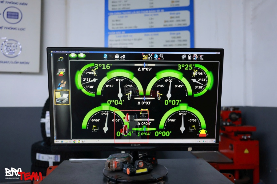 Chạy thử và căn chỉnh: Kiểm tra độ êm, kiểm tra độ chụm bánh xe bằng thiết bị điện tử và tinh chỉnh nếu cần thiết.