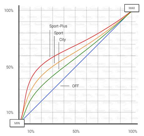 Đường màu đỏ đại diện cho chế độ Sport+, với thời gian phản ứng chân ga tối đa. Chỉ cần đạp nhẹ 10% chân ga, xe sẽ phản hồi với sức mạnh tương đương 40% chân ga khi không có PedalBox.