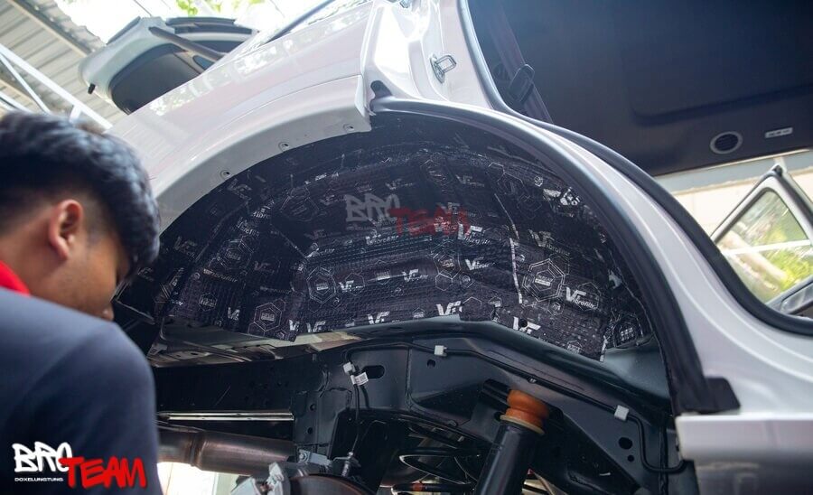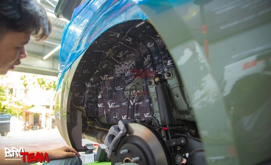 Sử dụng vật liệu cách âm đặc biệt, được thiết kế để hấp thụ âm thanh và giảm rung động. Vật liệu này có khả năng bám dính cao, không có mùi, và không gây nóng chảy, đảm bảo an toàn cho sức khỏe người dùng. Việc dán này sẽ giúp hạn chế âm thanh từ hốc bánh xe lọt vào bên trong xe, mang đến không gian yên tĩnh hơn.
