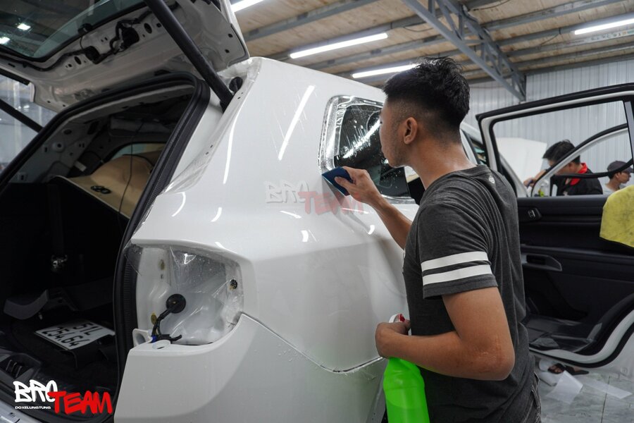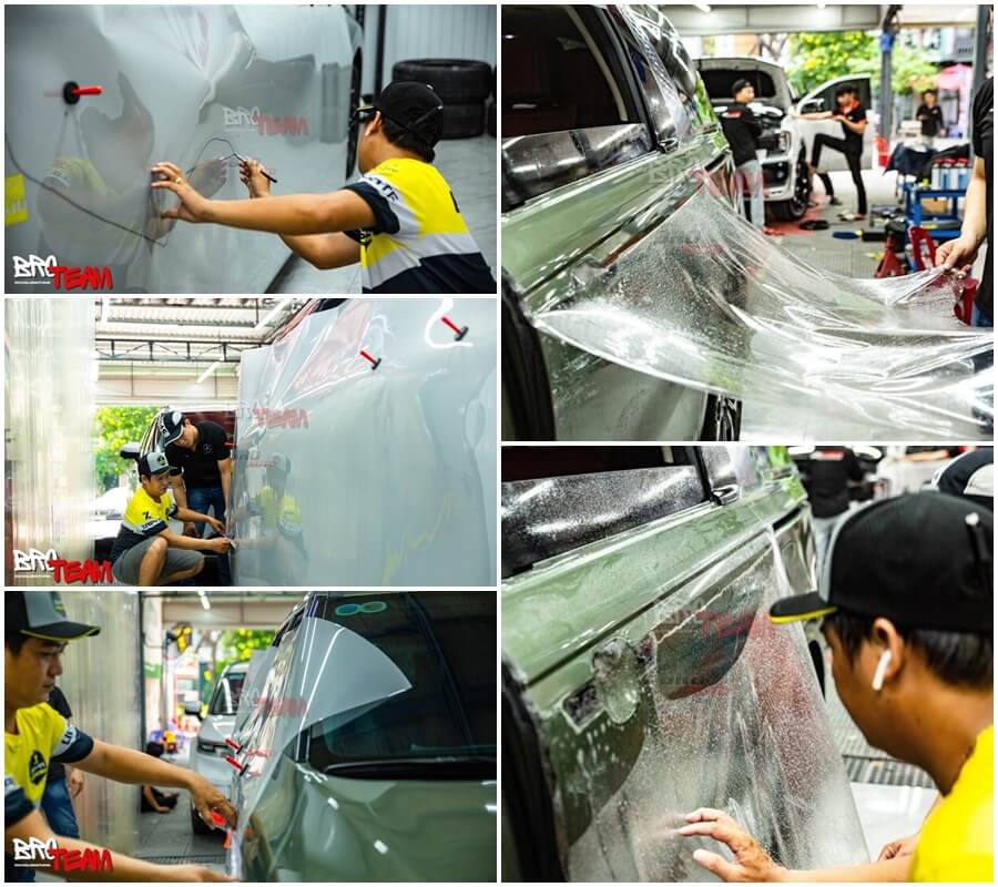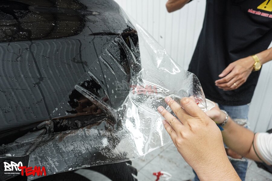 Dán PPF: Kỹ thuật viên sử dụng dung dịch chuyên dụng để dán PPF lên bề mặt sơn, đồng thời sử dụng công cụ chuyên dụng để loại bỏ bọt khí và đảm bảo PPF không bị nhăn hay gợn sóng.