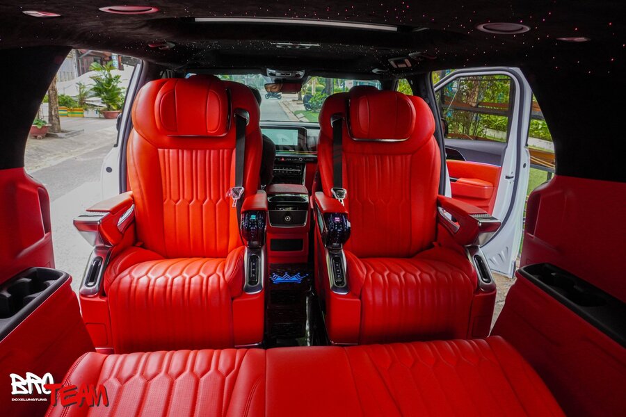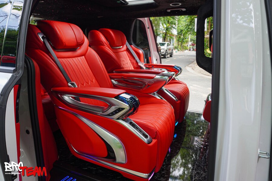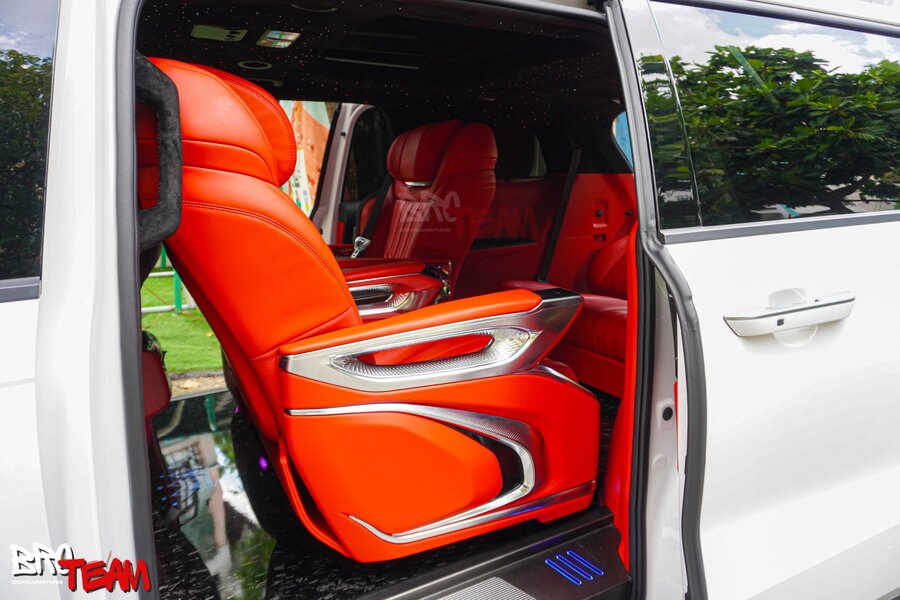 Bọc da và sơn đổi màu nội thất: Ghế tài xế, ghế phụ, và hàng ghế thứ ba đều được bọc da cao cấp và sơn đổi màu theo yêu cầu. Nội thất bao gồm taplo trên, dưới, thân và nắp con ngựa, tappi cửa tài phụ và cửa lùa cũng được bọc da và sơn đổi màu.