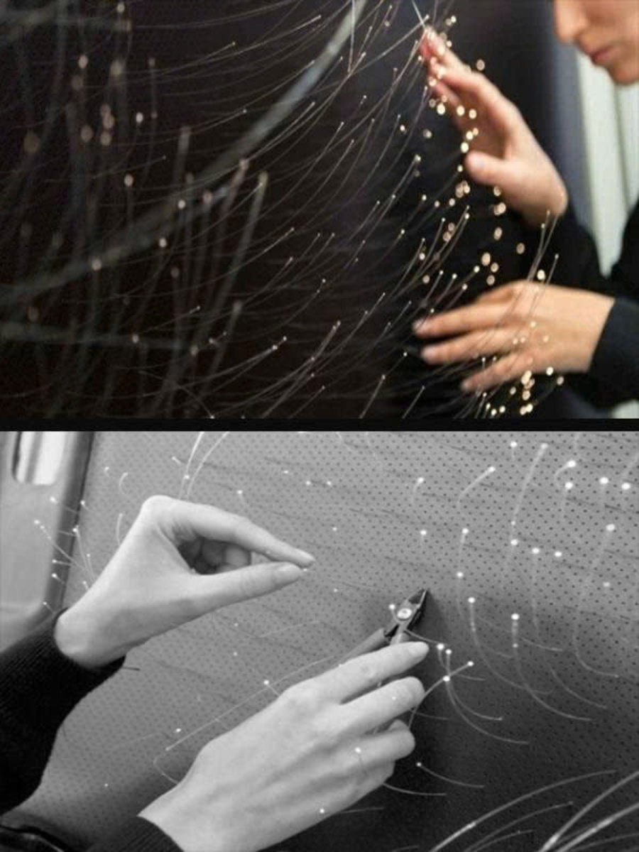 Sợi quang học: Dẫn ánh sáng từ nguồn LED đến các điểm sao trên trần xe, được gắn và đục xuyên qua lớp nỉ hoặc trần da