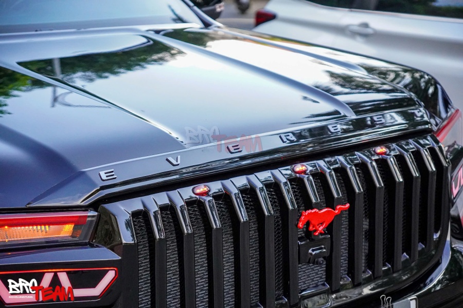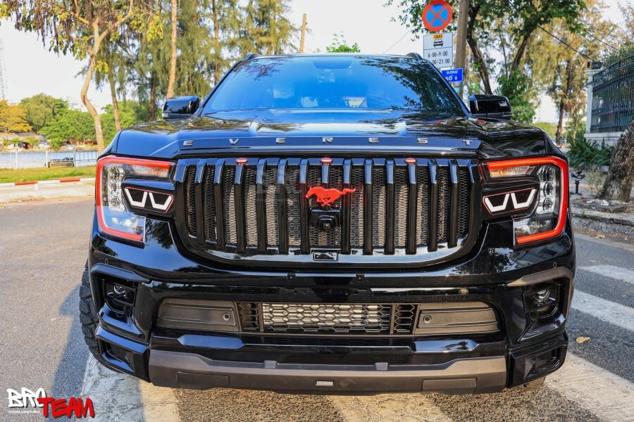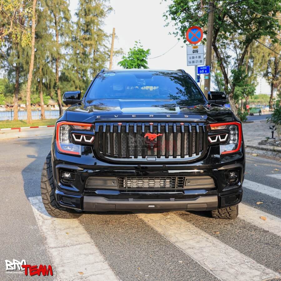 Mặt ca-lăng này có thiết kế mạnh mẽ, phong cách thể thao với các thanh dọc tạo điểm nhấn. Logo ngựa đỏ nổi bật, gợi liên tưởng đến dòng xe cơ bắp Mỹ. Đây có thể là mẫu nhập khẩu từ Thái Lan, thường được ưa chuộng để độ Ford Everest theo phong cách Ford Mustang.