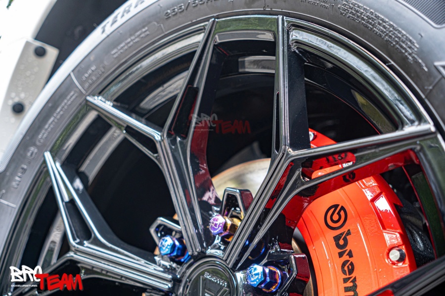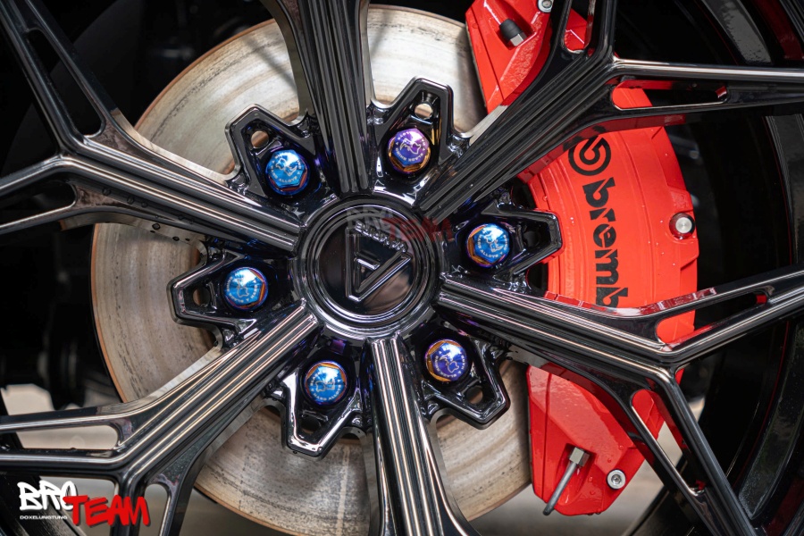 Hài hòa với phanh Brembo: Bộ phanh Brembo màu đỏ rực nổi bật làm nền, tôn thêm vẻ sang trọng và chuyên nghiệp của chi tiết ốc Titan.