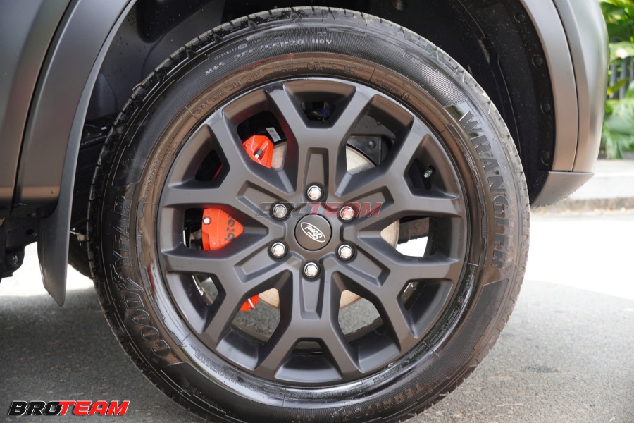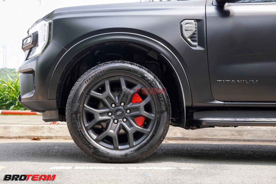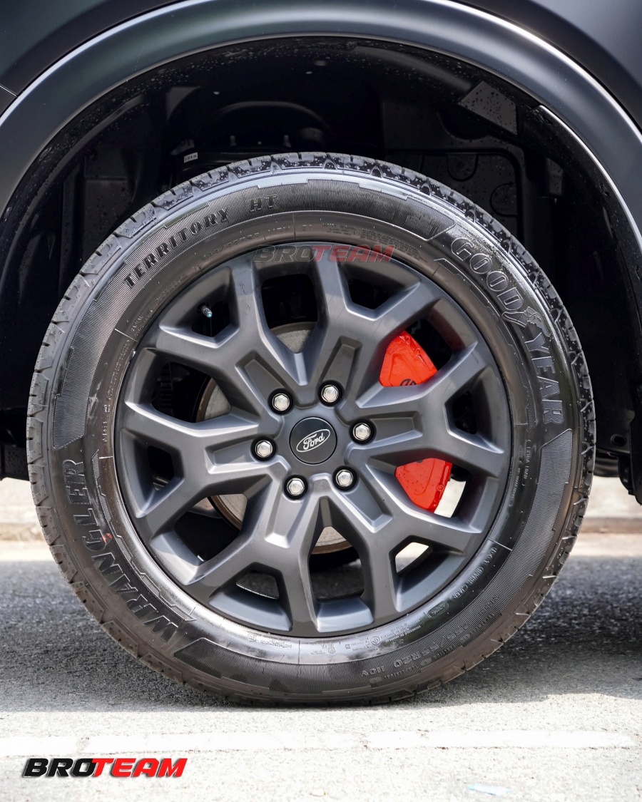 Sơn mâm đen nhám: bề mặt hoàn thiện mịn, đều màu, tăng chiều sâu thị giác, làm nổi bật kích thước bánh xe và tôn lên dáng đứng vững chãi của Ford Everest.