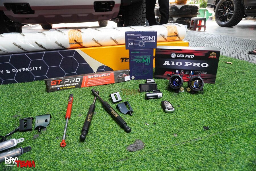Ford Ranger Raptor 2024 độ phụ kiện cần thiết bao gồm đèn LED tăng cường khả năng chiếu sáng, bảo vệ xe toàn diện với nắp thùng cuộn điện và lớp dán PPF, nâng cao tiện nghi với chìa khóa đề nổ từ xa và thảm lót sàn, đảm bảo an toàn với ty chống nắp capo và ty hãm bửng, và ghi lại hành trình với camera hành trình, tất cả đều được BRO TEAM tuyển chọn kỹ lưỡng, đảm bảo chất lượng và độ bền bỉ.