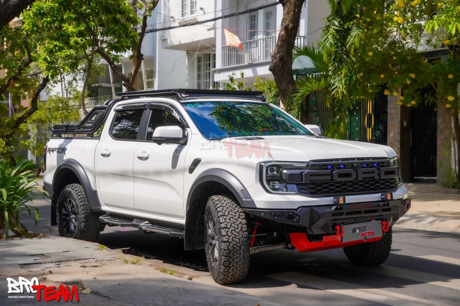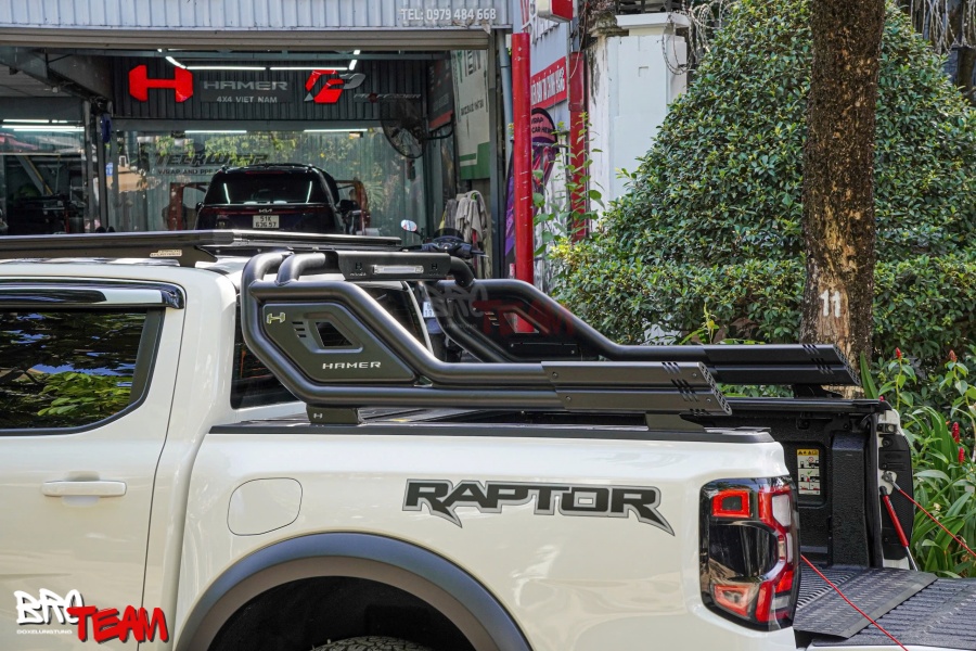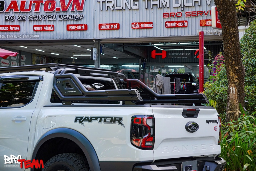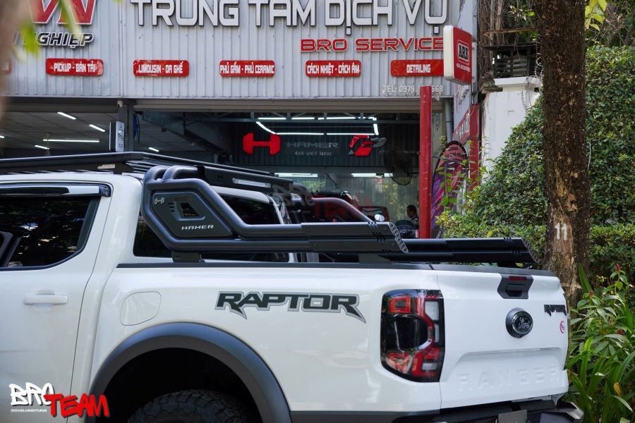 Ford Ranger Raptor độ phụ kiện Hamer giúp nâng cấp cả ngoại thất và nội thất, tạo nên diện mạo mạnh mẽ, cá tính cùng khả năng vận hành tối ưu. Ngoại thất nổi bật với baga mui Hamer Rack, cản trước Guardian-AM112, cản sau Nova Series MX204, thanh thể thao Night Fury, nắp cuộn điện Aeroklas Thái Lan, bầu hơi Airbag Man, cùng hệ thống đèn LED tăng sáng. Nội thất được nâng cấp với đèn LED viền, ghế sau chỉnh điện, loa trung tâm JBL GX 328, thảm lót sàn khuôn đúc cao cấp. Đến ngay BRO TEAM để biến chiếc Raptor của bạn thành một cỗ máy off-road thực thụ!