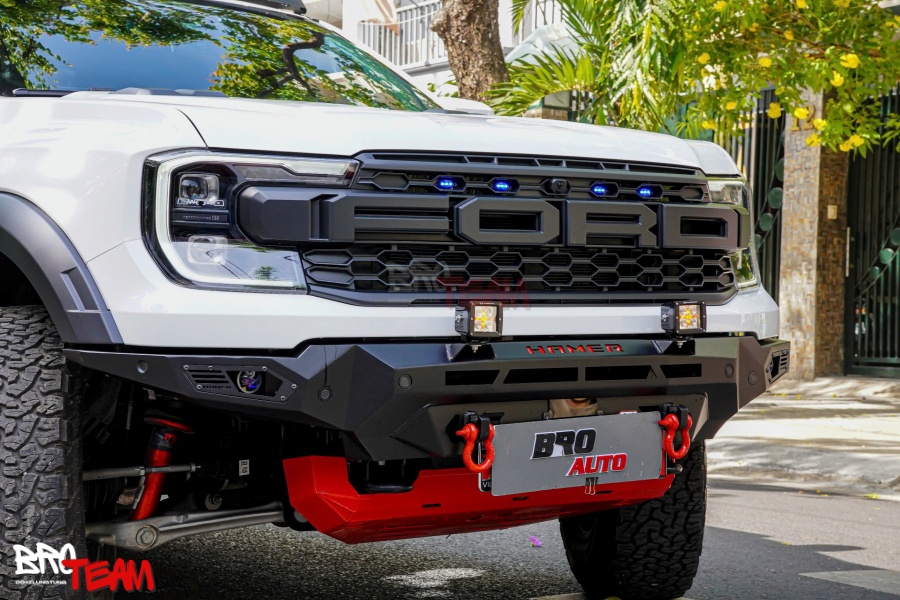 Ford Ranger Raptor độ phụ kiện Hamer giúp xe mạnh mẽ hơn, bảo vệ tốt hơn và tăng trải nghiệm lái. Ngoại thất trang bị cản trước Guardian-AM112, cản sau Nova Series MX204, thanh thể thao Night Fury, baga mui Hamer Rack, nắp cuộn điện Aeroklas, bầu hơi Airbag Man, đèn LED định vị và giáp gầm bảo vệ tối đa. Nội thất được nâng cấp với ghế sau chỉnh điện, đèn LED viền, loa JBL GX 328 và thảm lót sàn khuôn đúc cao cấp. Đến BRO TEAM ngay để biến chiếc Raptor của bạn thành một chiến binh thực thụ!