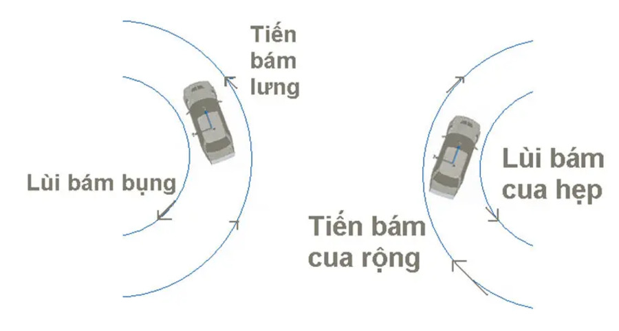 Khi cho xe tiến vào ngõ nhỏ hoặc khu vực hẹp, tài mới nên bám sát vào phần đường bên ngoài (bám lưng). Cách làm này đảm bảo rằng khi phần đuôi xe di chuyển theo, nó sẽ không va chạm với các vật cản xung quanh. Ngược lại, khi lùi xe ra khỏi không gian hẹp, cần bám vào phần đường bên trong (bám bụng) để đảm bảo phần đầu xe không bị va chạm khi di chuyển ra ngoài.