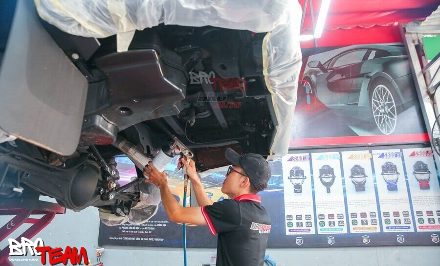 Làm sạch toàn diện: Sử dụng dung dịch chuyên dụng để tẩy sạch bụi bẩn, dầu mỡ và các chất cặn bã trên gầm xe và hốc bánh xe. Quá trình này giúp lớp sơn phủ bám dính tốt hơn và kéo dài tuổi thọ.