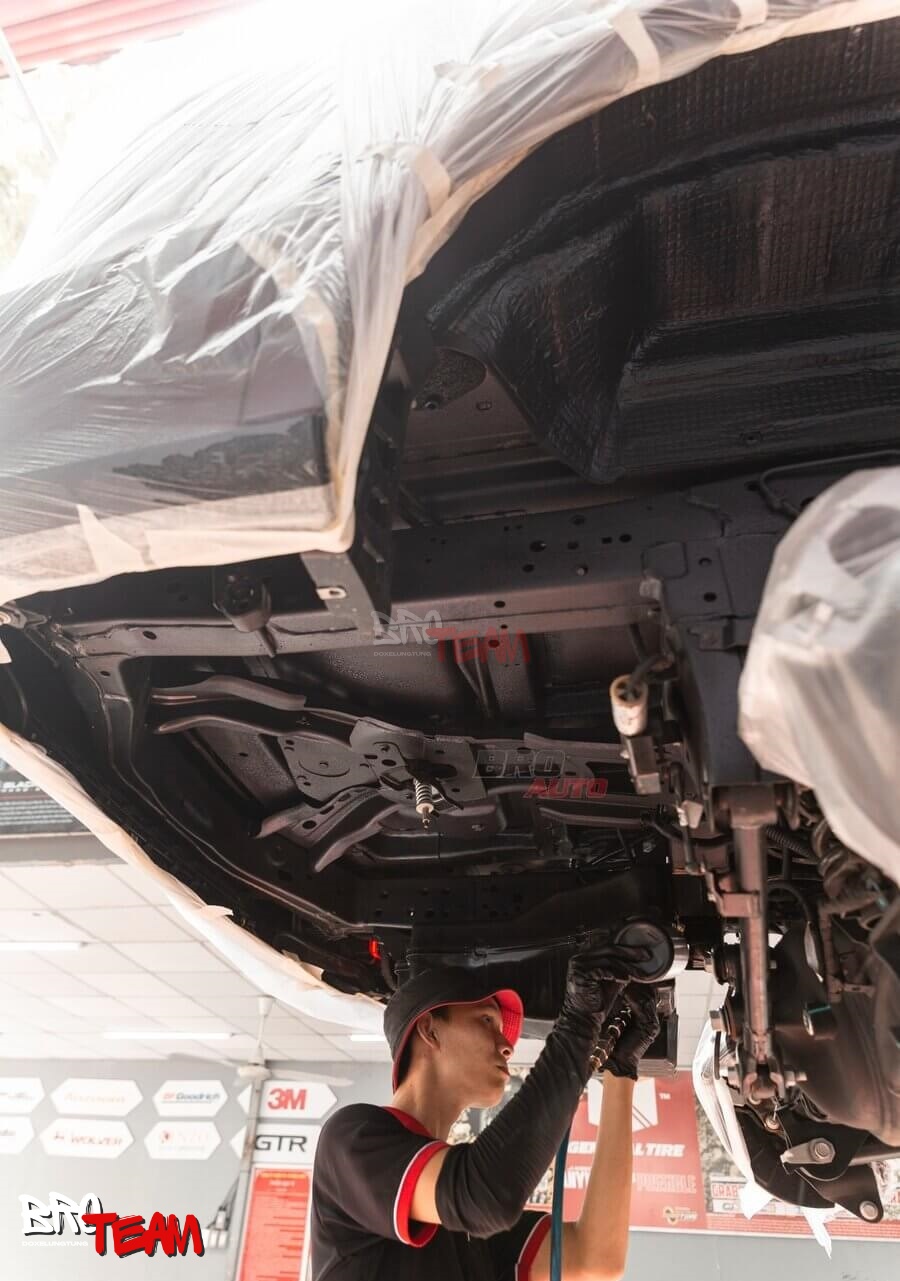 Sơn phủ gầm ô tô là quá trình phun một lớp chất bảo vệ chuyên dụng lên khung sườn và gầm xe nhằm tăng cường độ bền và khả năng chống chịu trước các tác nhân gây hại như nước, bùn đất, muối ăn mòn, hóa chất và đá văng. Lớp phủ này không chỉ giúp hạn chế rỉ sét, kéo dài tuổi thọ của gầm xe mà còn hỗ trợ cách âm, giảm tiếng ồn vọng từ mặt đường và tăng khả năng cách nhiệt, mang lại trải nghiệm lái xe êm ái, thoải mái hơn.